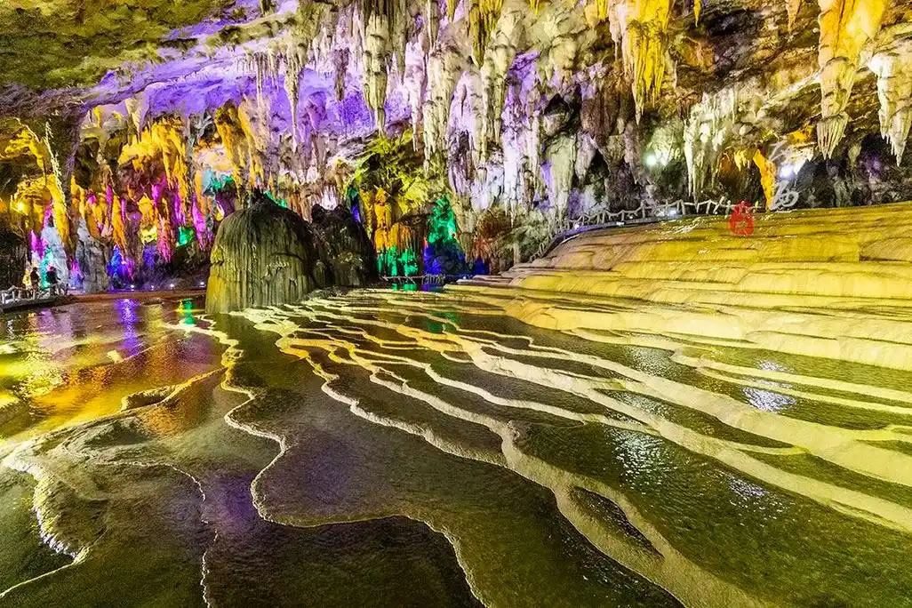 - 核心特色:洞內(nèi)分四層結(jié)構(gòu),已開(kāi)放第二層約2公里游覽線,包含五大主題廳——吉星迎賓、壯鄉(xiāng)聽(tīng)海、云山鑒水、詩(shī)畫(huà)田園、幽靜奇觀。景觀涵蓋鈣華池梯田、神象賜福、天下第一鐘等1000余處天然獨(dú)立景觀,其中鈣華池群面積達(dá)6000平方米,黑白對(duì)比形成獨(dú)特視覺(jué)奇觀。