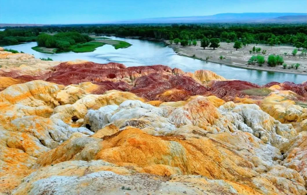 - 特色:以“一河隔兩岸”奇觀聞名——北岸雅丹地貌色彩斑斕(紅/綠/紫/黃/棕),南岸河谷綠洲森林茂密,額爾齊斯河穿流其間,形成“半邊火焰半邊森林”的魔幻畫(huà)面。