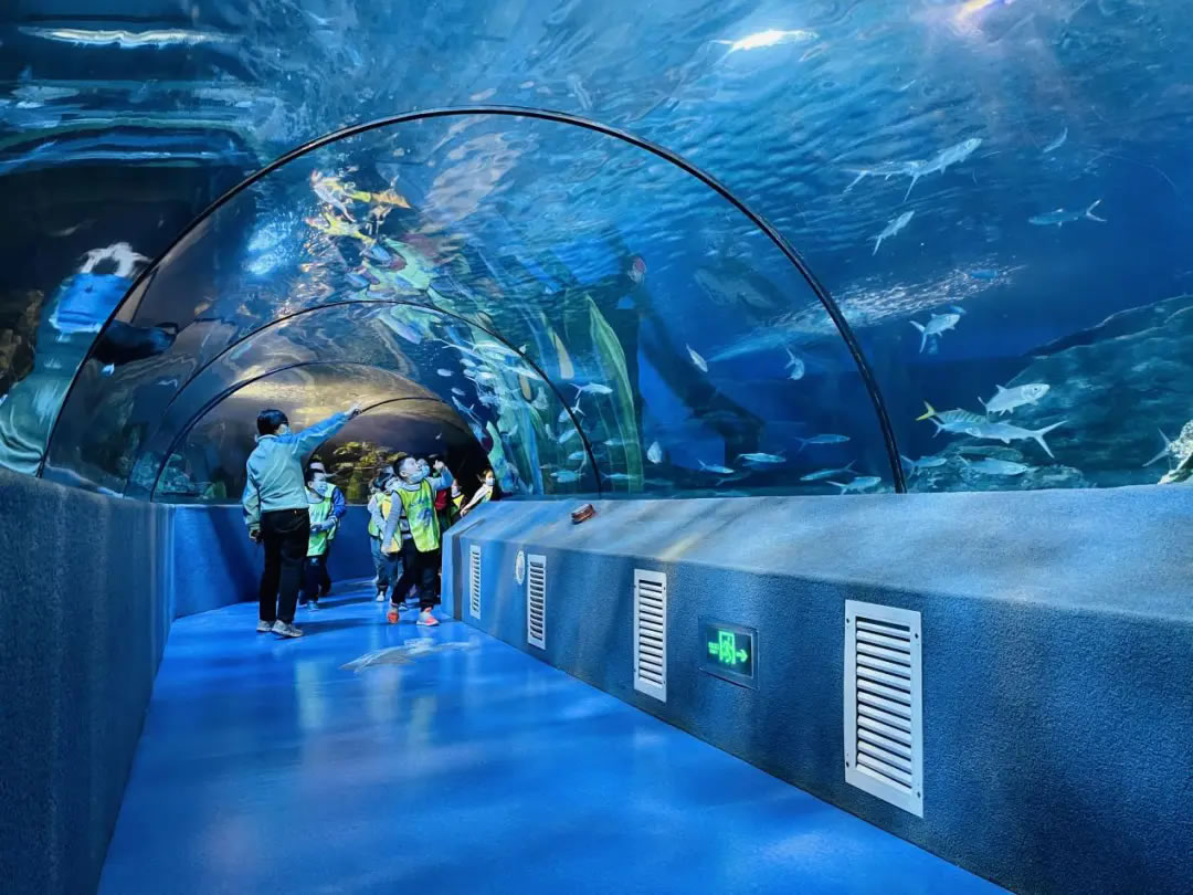 - 海底隧道:80米長、270度亞克力玻璃環(huán)繞,鯊魚、鰩魚從頭頂掠過,搭配丁達(dá)爾效應(yīng)光影,形成震撼視覺體驗。