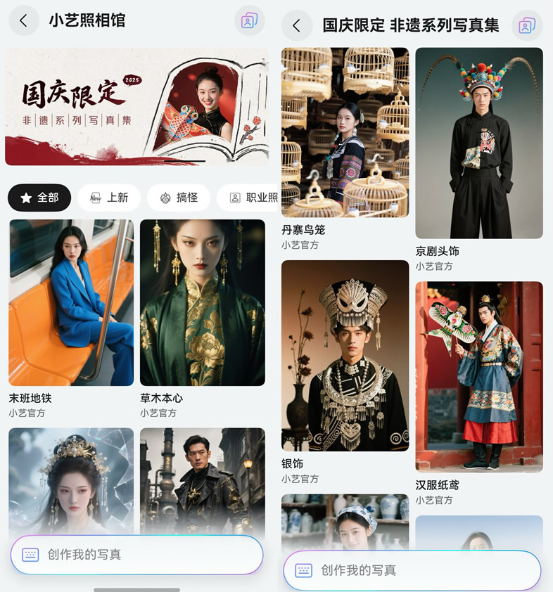 另外,對(duì)于想拍文化感滿滿的國(guó)風(fēng)影像的用戶,小藝照相館Agent上線了國(guó)慶限定非遺系列模板,進(jìn)入小藝App>右下角發(fā)現(xiàn)>智能體>小藝照相館后,在國(guó)慶限定專區(qū)選擇喜歡的模板,然后就可按步驟生成高質(zhì)量的國(guó)風(fēng)寫真,打造專屬非遺系列寫真紀(jì)念冊(cè)。