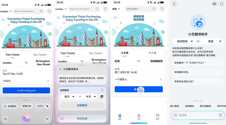 當(dāng)然,小藝的能力遠(yuǎn)不止于此。海外出行時(shí),用戶翻閱外文網(wǎng)站或使用外文App,只需長(zhǎng)按屏幕底部小藝導(dǎo)航條,點(diǎn)擊“連續(xù)翻譯”,或直接喚醒小藝后說“連續(xù)翻譯”,即可體驗(yàn)邊瀏覽邊翻譯的效果。當(dāng)需要與外國(guó)友人進(jìn)行面對(duì)面溝通時(shí),使用小藝的面對(duì)面翻譯幫你輕松應(yīng)對(duì)跨語言溝通場(chǎng)景;遇見不認(rèn)識(shí)的外文路牌、菜單,拍照發(fā)給小藝翻譯助手秒翻譯。