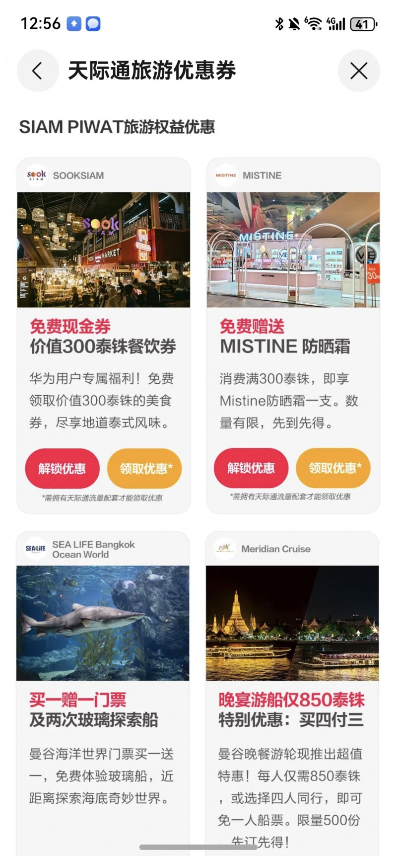 華為手機(jī)用戶開啟天際通流量后,可以在泰國、馬來西亞、越南、印尼免費(fèi)領(lǐng)取Grab游客優(yōu)惠禮包,憑Grab優(yōu)惠禮包即可享受精選服務(wù),包括機(jī)場接送、打車折扣、外賣餐飲、超市購物等出游場景,輕松暢游東南亞。還可領(lǐng)取Klook旅游權(quán)益優(yōu)惠,無論您是在中國香港&澳門暢游看夜景,還是在日本觀賞和風(fēng)之美,在韓國感受韓風(fēng)潮流、越南邂逅燈火古鎮(zhèn),即可享受景點(diǎn)購票全單95折優(yōu)惠。在活動(dòng)頁還可領(lǐng)取朗廷卓逸會(huì)全球酒店住宿禮遇及專屬優(yōu)惠房價(jià),共覆蓋全球超過30家知名酒店。