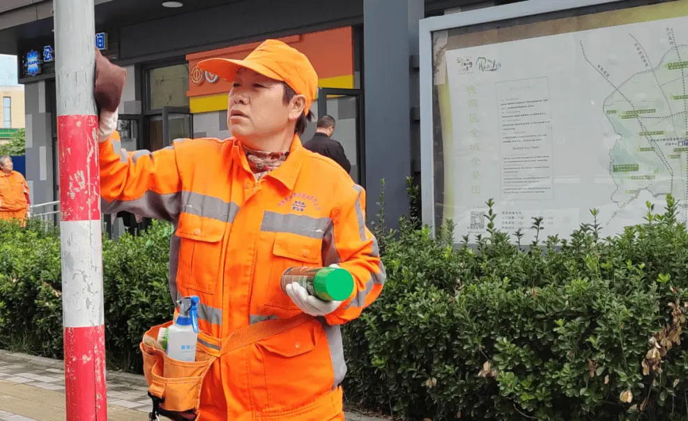 在槐蔭區(qū),環(huán)衛(wèi)工人馬增霞隨身攜帶“八寶袋”,對齊州路沿線的垃圾桶、路燈桿、公交站牌等進行清掃。“這個‘八寶袋’里有軟毛刷、硬毛刷、除膠劑、手套、噴壺等8種工具。”馬增霞介紹,“八寶袋”輕便易攜且取用便捷,可實現(xiàn)“一包在手,百污可除”,有效提升了主次干道人行道、交通出入口等重點區(qū)域的動態(tài)巡查處置效率;夾層內(nèi)的清涼油、創(chuàng)可貼、速效救心丸,既為保潔人員提供安全防護,也能滿足市民應急需求。